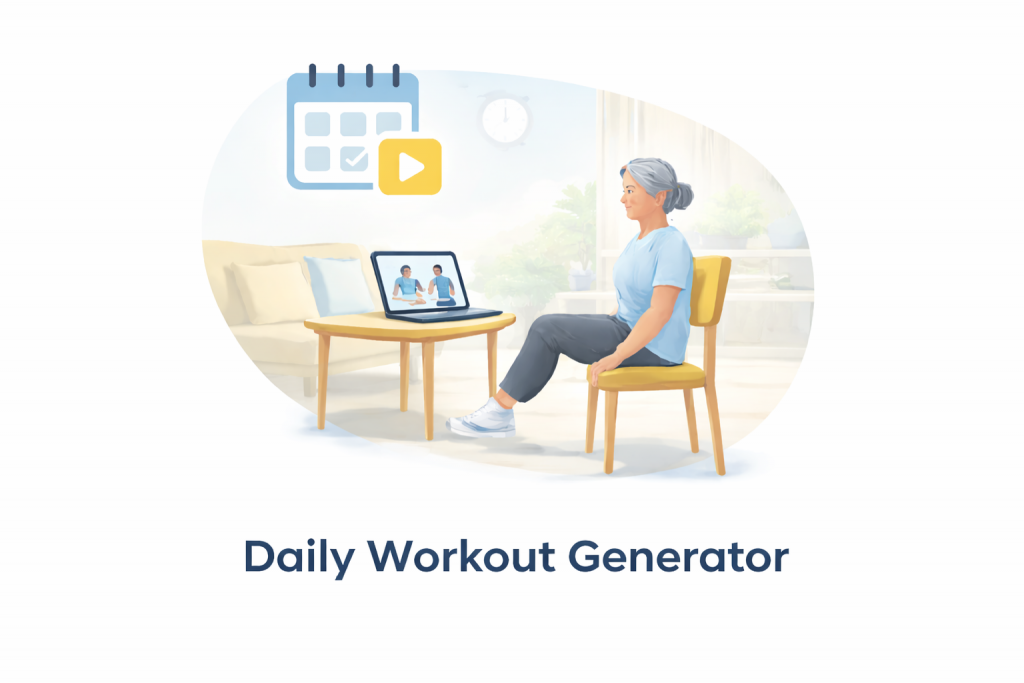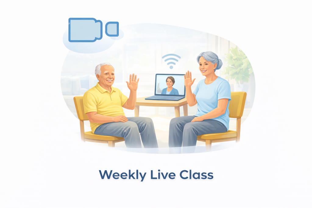 A guided, chair-supported session delivered live at the same time each week.